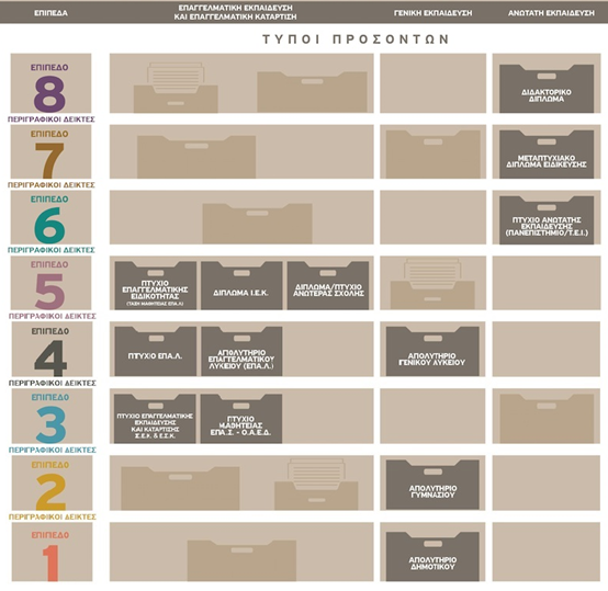 Τα 8 επίπεδα του Εθνικού Πλαισίου Προσόντων καλύπτουν ολόκληρο το φάσμα των προσόντων από την πρωτοβάθμια έως την ανώτατη εκπαίδευση. Κάθε επίπεδο περιλαμβάνει ένα σύνολο γνώσεων, δεξιοτήτων και ικανοτήτων που καθορίζουν τα μαθησιακά αποτελέσματα. Τα μαθησιακά αποτελέσματα συγκροτούν τα προσόντα του αντίστοιχου επιπέδου.